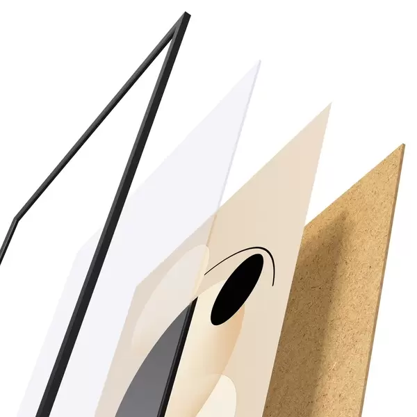 De poster bestaat uit een frame, plexiglas, geprinte afbeelding en spaanplaat achterkant. De poster kan meteen aan de muur worden gehangen dankzij de bevestigingen op de achterkant.