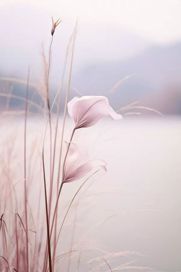 Poster Delicate roze bloesems aan een rustig meer N° f46503