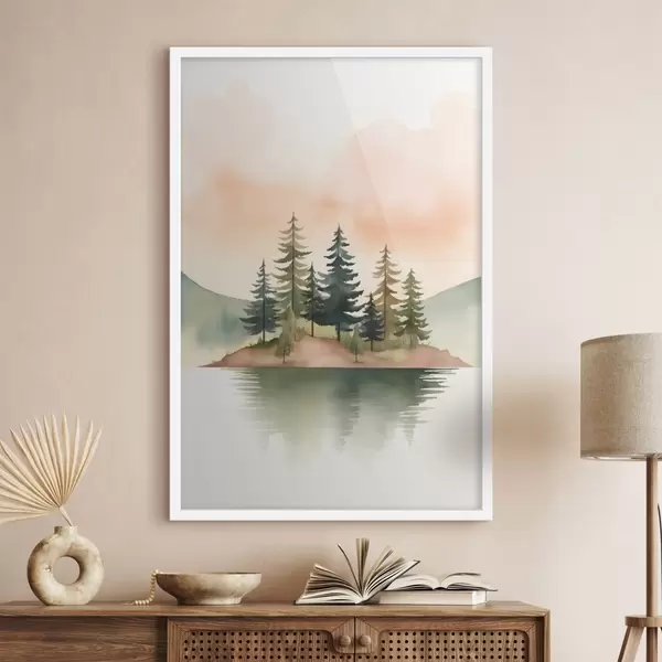 Poster Aquarel dennen op een mistig eilandje, zachte perzikkleurige lucht N° f46505
