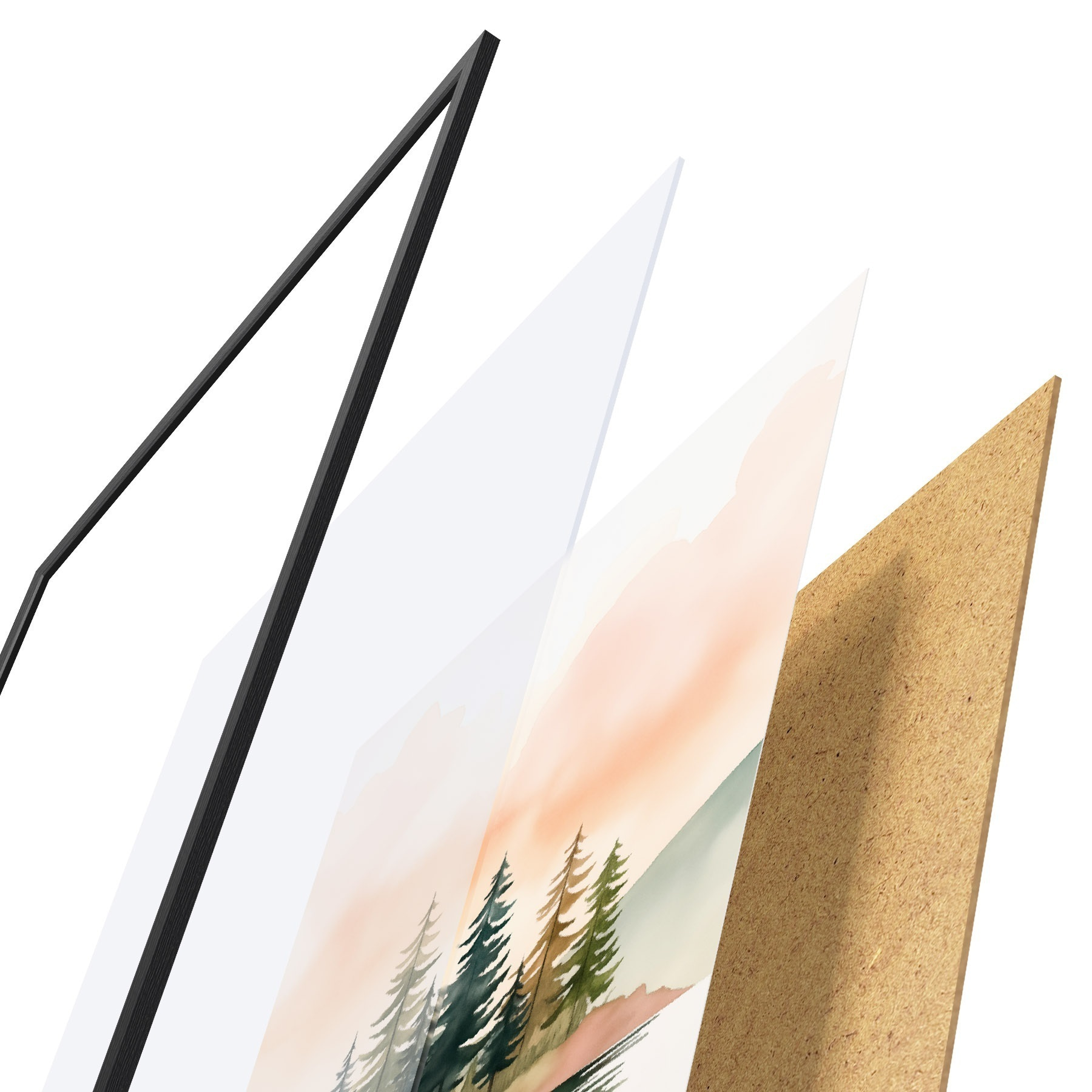 De poster bestaat uit een frame, plexiglas, geprinte afbeelding en spaanplaat achterkant. De poster kan meteen aan de muur worden gehangen dankzij de bevestigingen op de achterkant.