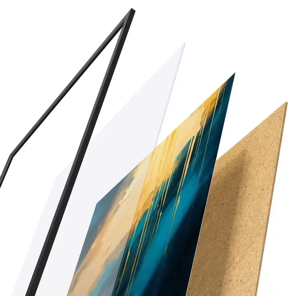 De poster bestaat uit een frame, plexiglas, geprinte afbeelding en spaanplaat achterkant. De poster kan meteen aan de muur worden gehangen dankzij de bevestigingen op de achterkant.