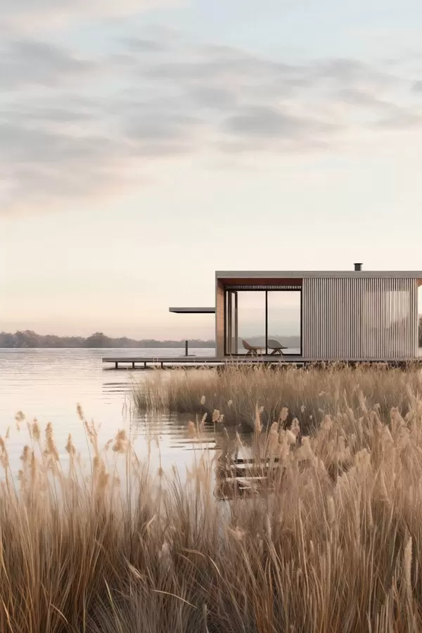 Poster Moderne hut aan het meer tussen het riet in de zachte schemering N° f46513