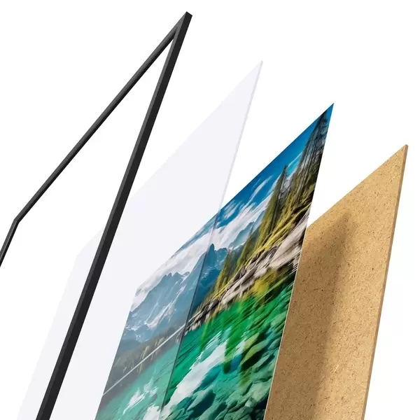 De poster bestaat uit een frame, plexiglas, geprinte afbeelding en spaanplaat achterkant. De poster kan meteen aan de muur worden gehangen dankzij de bevestigingen op de achterkant.
