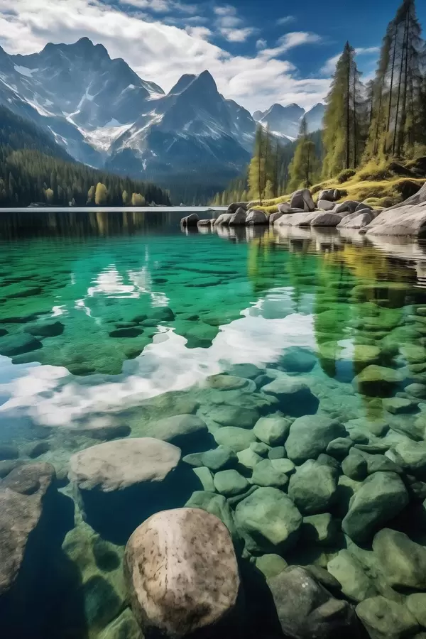 Poster Smaragdgroen bergmeer met rotsen eronder en torenhoge bergtoppen N° f46515