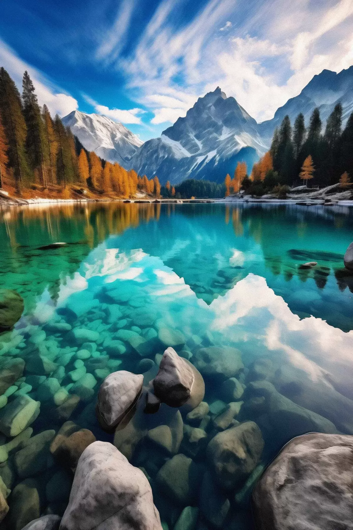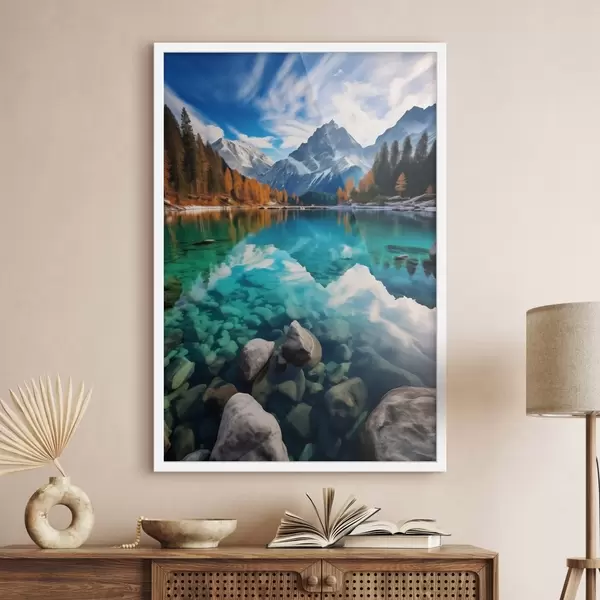 Poster Bergmeer met turquoise water en herfstlariksbomen N° f46517