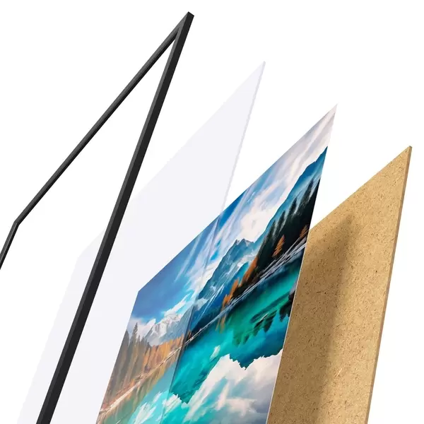 De poster bestaat uit een frame, plexiglas, geprinte afbeelding en spaanplaat achterkant. De poster kan meteen aan de muur worden gehangen dankzij de bevestigingen op de achterkant.
