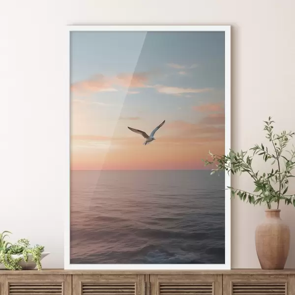 Poster Meeuw boven de zee bij een roze-perzikkleurige zonsondergang N° f46520