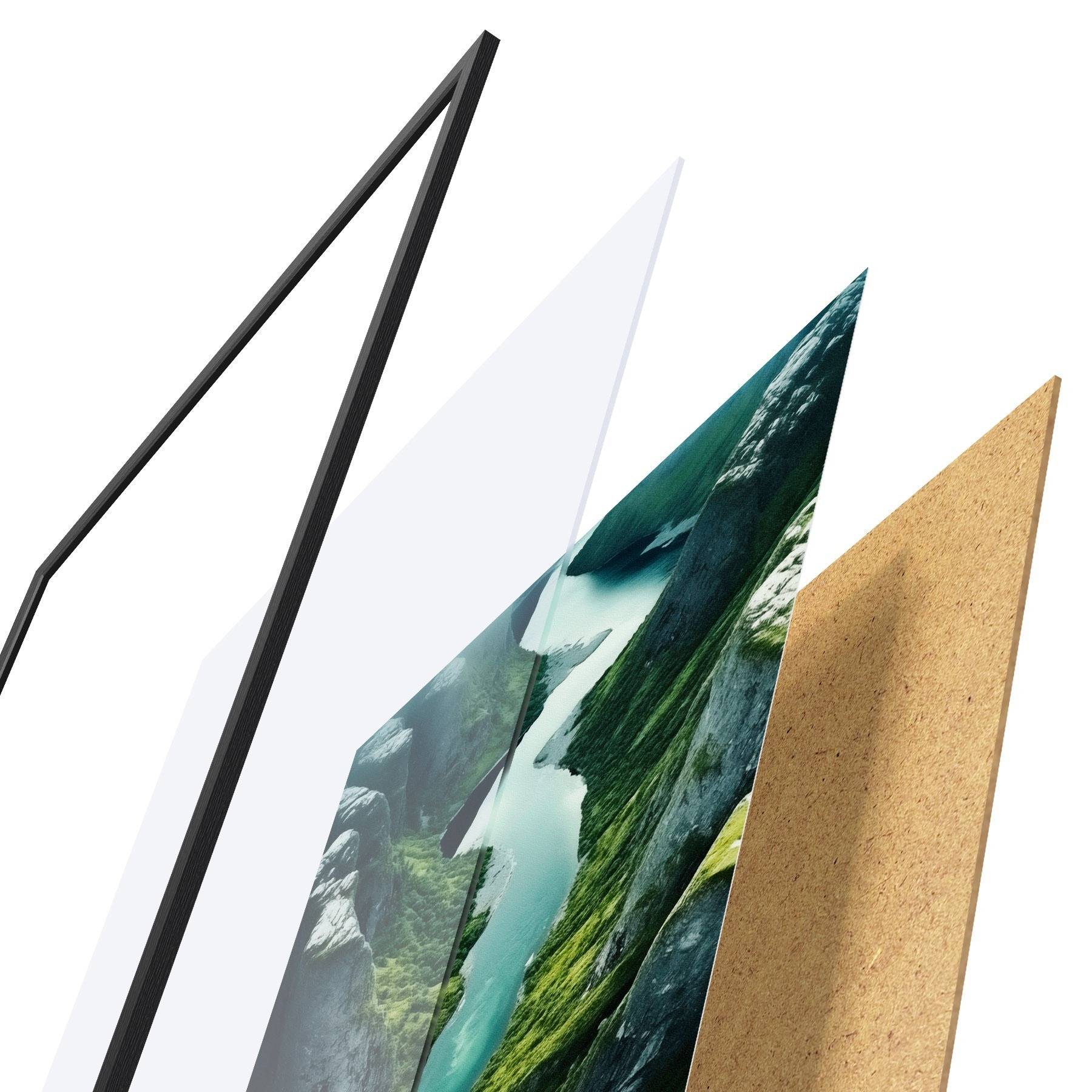 De poster bestaat uit een frame, plexiglas, geprinte afbeelding en spaanplaat achterkant. De poster kan meteen aan de muur worden gehangen dankzij de bevestigingen op de achterkant.