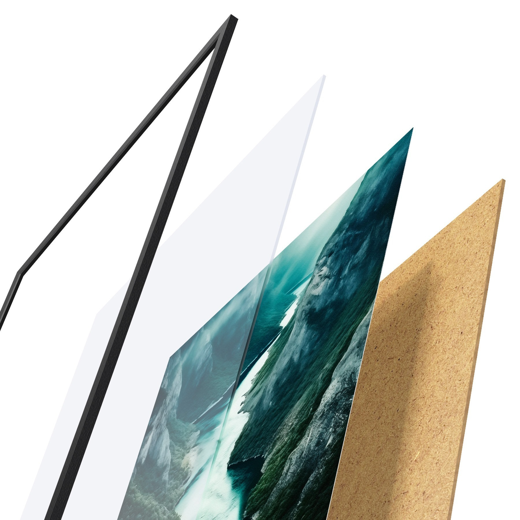De poster bestaat uit een frame, plexiglas, geprinte afbeelding en spaanplaat achterkant. De poster kan meteen aan de muur worden gehangen dankzij de bevestigingen op de achterkant.