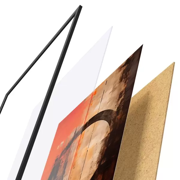 De poster bestaat uit een frame, plexiglas, geprinte afbeelding en spaanplaat achterkant. De poster kan meteen aan de muur worden gehangen dankzij de bevestigingen op de achterkant.