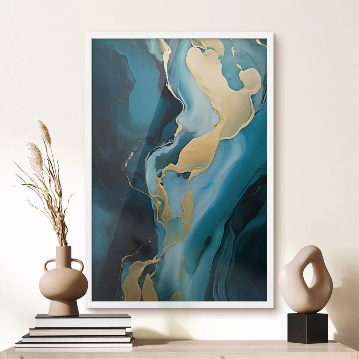 Poster Tealblauw abstract met een stroom oker N° f46530