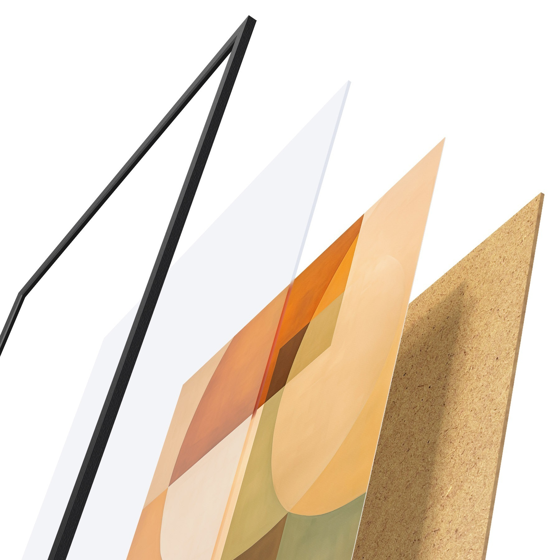 De poster bestaat uit een frame, plexiglas, geprinte afbeelding en spaanplaat achterkant. De poster kan meteen aan de muur worden gehangen dankzij de bevestigingen op de achterkant.