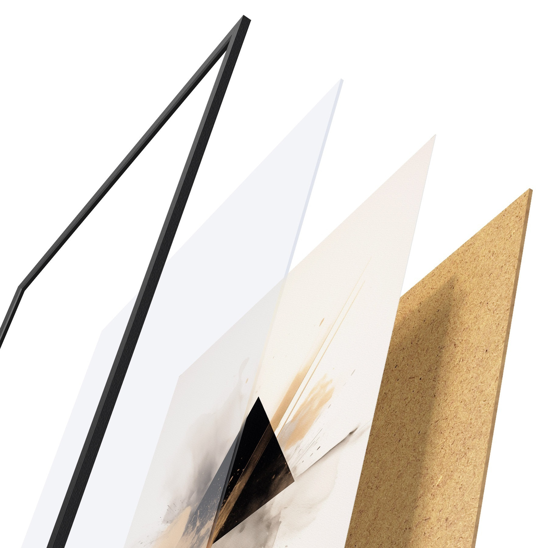 De poster bestaat uit een frame, plexiglas, geprinte afbeelding en spaanplaat achterkant. De poster kan meteen aan de muur worden gehangen dankzij de bevestigingen op de achterkant.