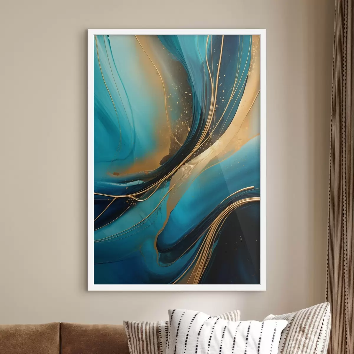 Poster Turquoise stroom met dunne okerkleurige draden N° f46543
