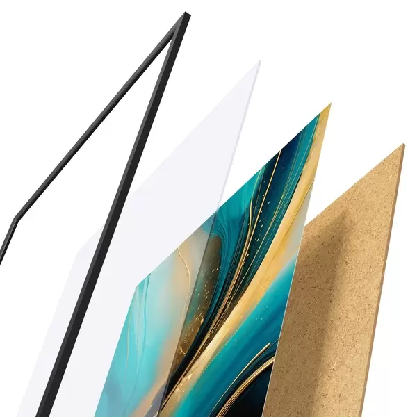 De poster bestaat uit een frame, plexiglas, geprinte afbeelding en spaanplaat achterkant. De poster kan meteen aan de muur worden gehangen dankzij de bevestigingen op de achterkant.
