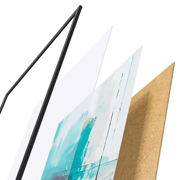 De poster bestaat uit een frame, plexiglas, geprinte afbeelding en spaanplaat achterkant. De poster kan meteen aan de muur worden gehangen dankzij de bevestigingen op de achterkant.