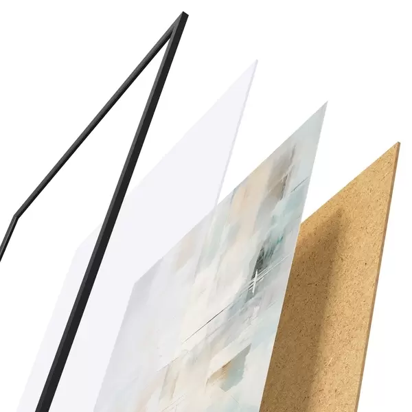 De poster bestaat uit een frame, plexiglas, geprinte afbeelding en spaanplaat achterkant. De poster kan meteen aan de muur worden gehangen dankzij de bevestigingen op de achterkant.