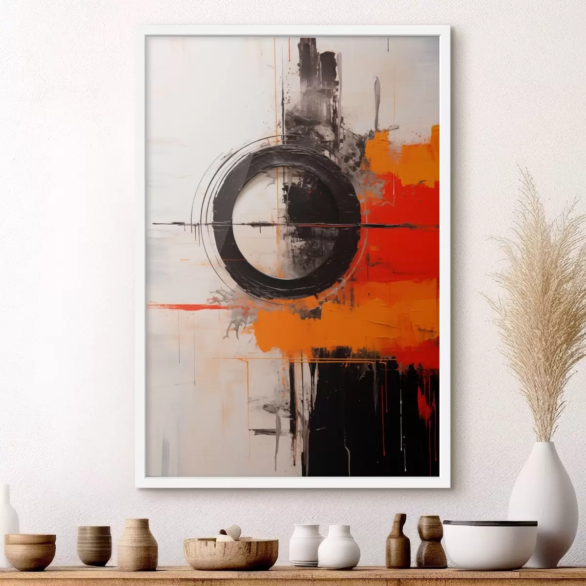 Poster Zwarte cirkel op wit, oranje strepen en spatten N° f46549
