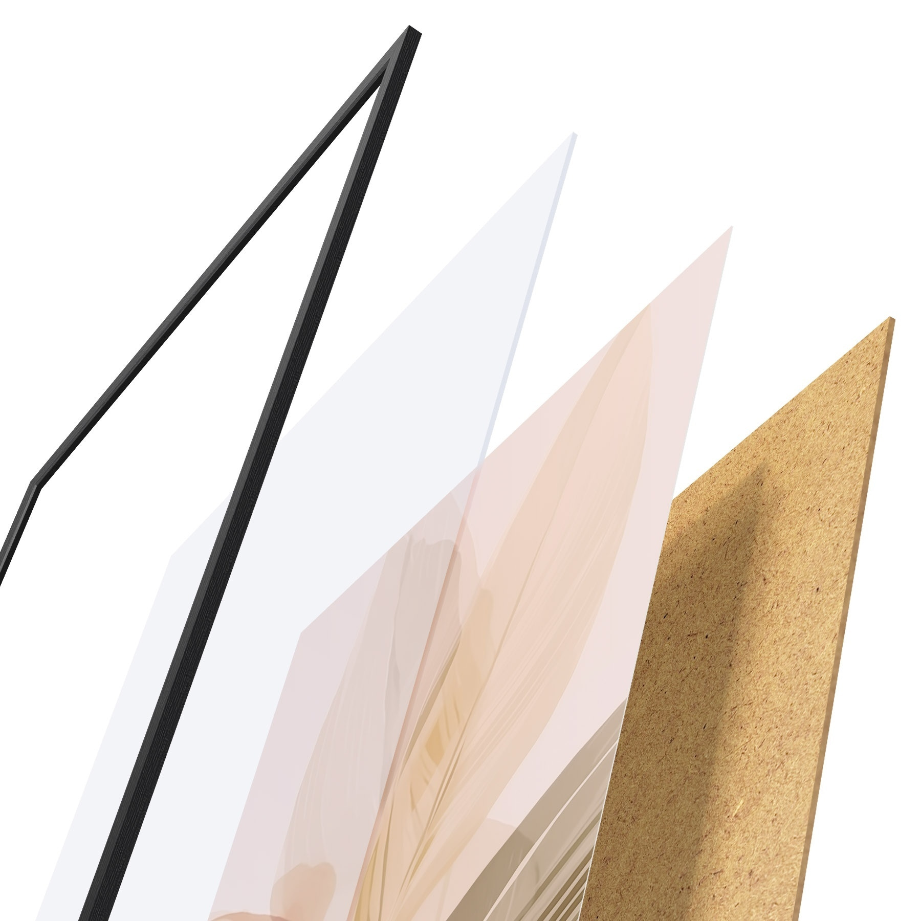 De poster bestaat uit een frame, plexiglas, geprinte afbeelding en spaanplaat achterkant. De poster kan meteen aan de muur worden gehangen dankzij de bevestigingen op de achterkant.