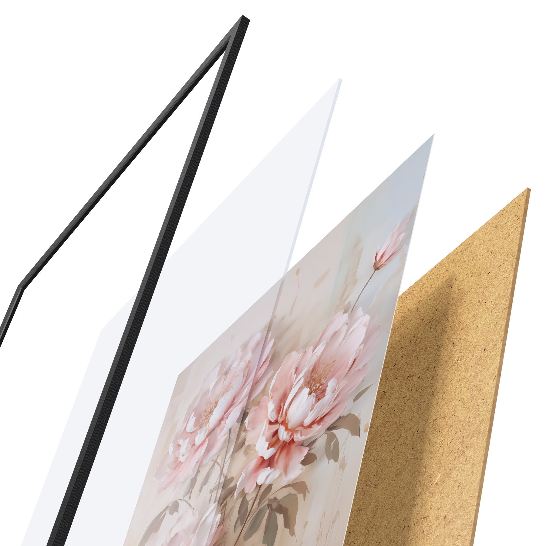 De poster bestaat uit een frame, plexiglas, geprinte afbeelding en spaanplaat achterkant. De poster kan meteen aan de muur worden gehangen dankzij de bevestigingen op de achterkant.