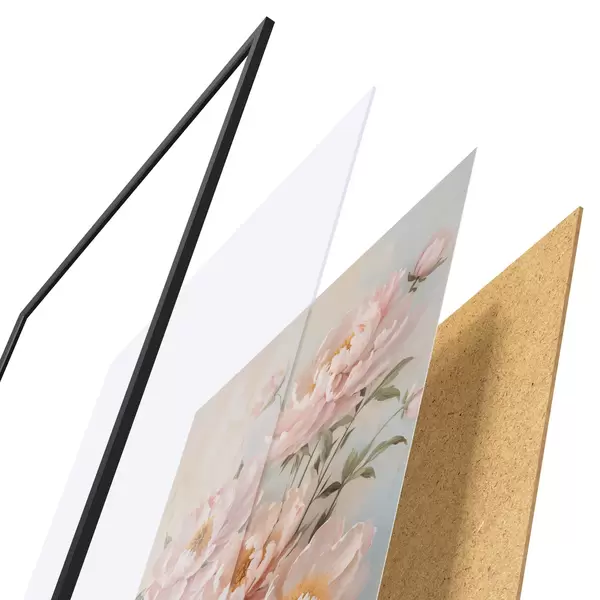 De poster bestaat uit een frame, plexiglas, geprinte afbeelding en spaanplaat achterkant. De poster kan meteen aan de muur worden gehangen dankzij de bevestigingen op de achterkant.