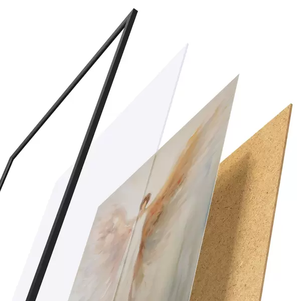 De poster bestaat uit een frame, plexiglas, geprinte afbeelding en spaanplaat achterkant. De poster kan meteen aan de muur worden gehangen dankzij de bevestigingen op de achterkant.