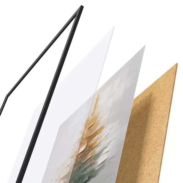 De poster bestaat uit een frame, plexiglas, geprinte afbeelding en spaanplaat achterkant. De poster kan meteen aan de muur worden gehangen dankzij de bevestigingen op de achterkant.