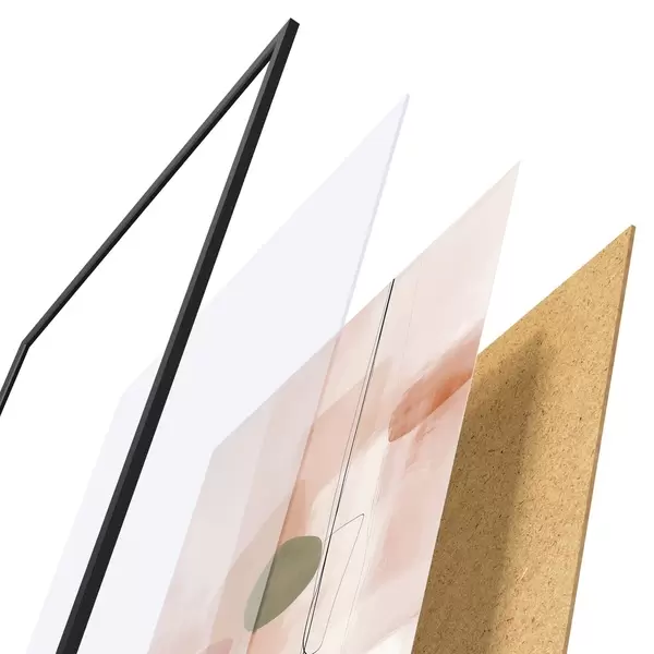 De poster bestaat uit een frame, plexiglas, geprinte afbeelding en spaanplaat achterkant. De poster kan meteen aan de muur worden gehangen dankzij de bevestigingen op de achterkant.
