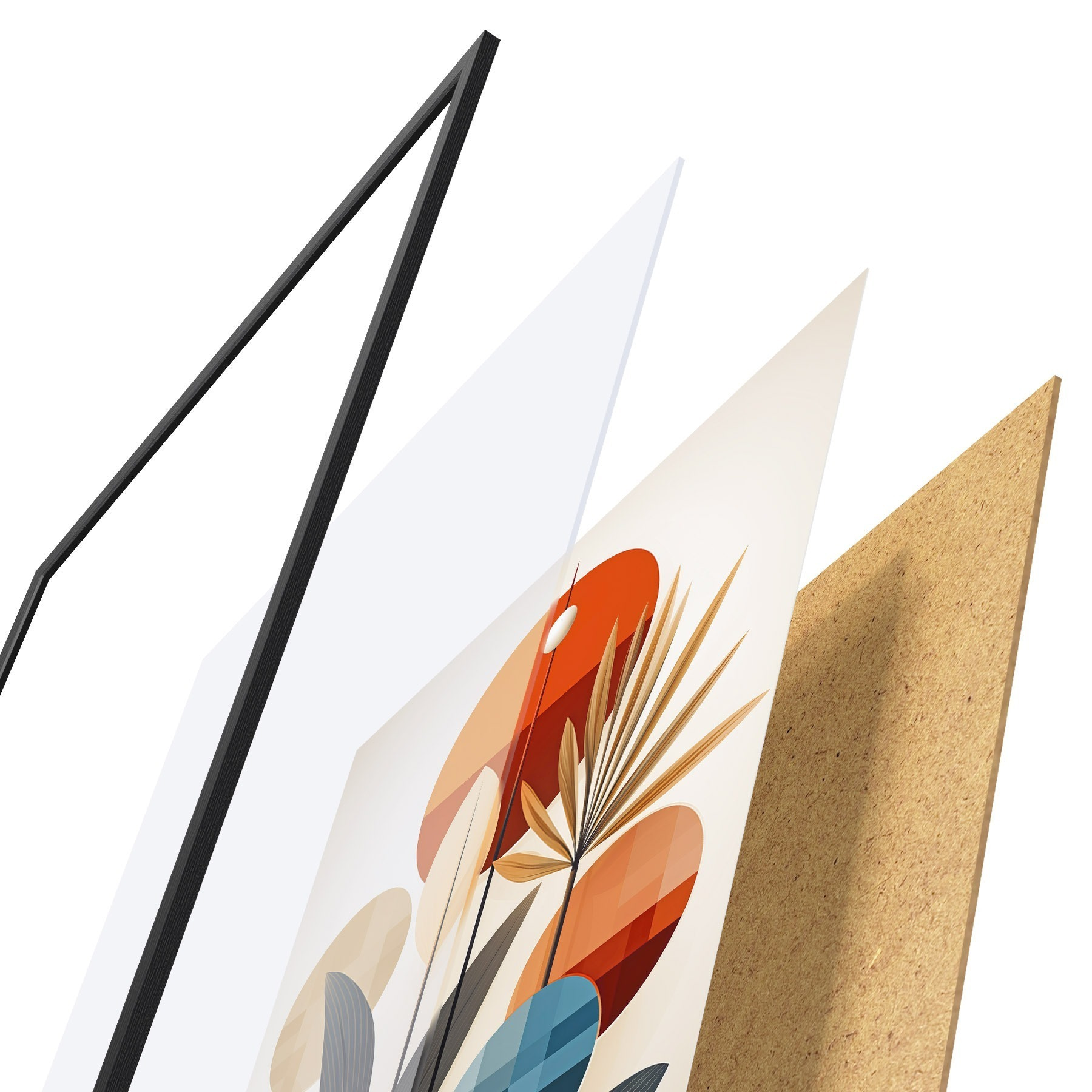 De poster bestaat uit een frame, plexiglas, geprinte afbeelding en spaanplaat achterkant. De poster kan meteen aan de muur worden gehangen dankzij de bevestigingen op de achterkant.