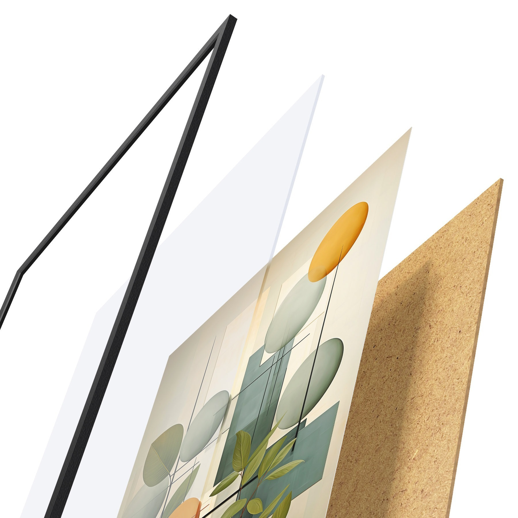 De poster bestaat uit een frame, plexiglas, geprinte afbeelding en spaanplaat achterkant. De poster kan meteen aan de muur worden gehangen dankzij de bevestigingen op de achterkant.