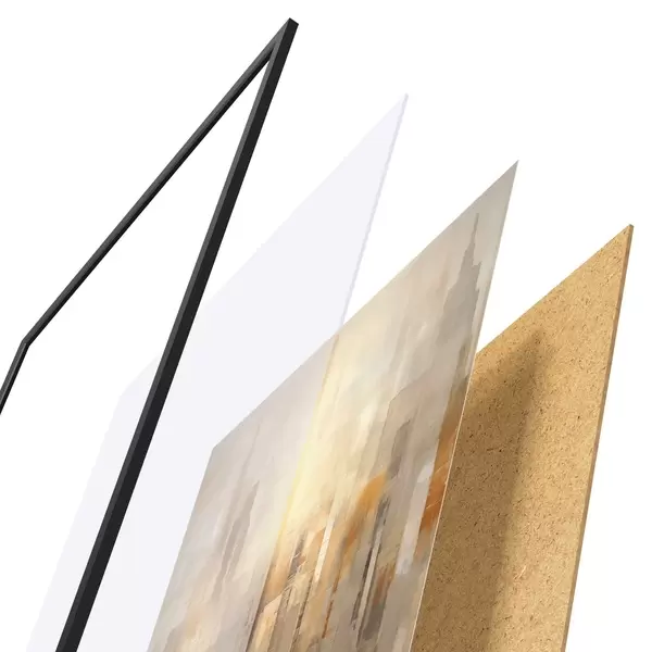 De poster bestaat uit een frame, plexiglas, geprinte afbeelding en spaanplaat achterkant. De poster kan meteen aan de muur worden gehangen dankzij de bevestigingen op de achterkant.