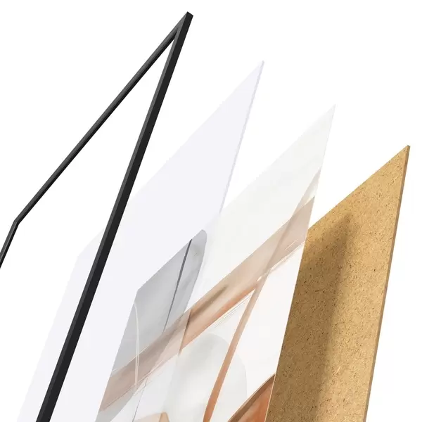 De poster bestaat uit een frame, plexiglas, geprinte afbeelding en spaanplaat achterkant. De poster kan meteen aan de muur worden gehangen dankzij de bevestigingen op de achterkant.