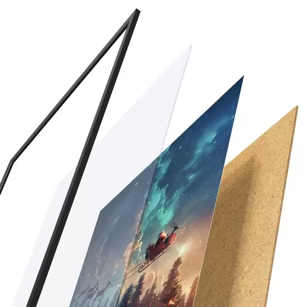 De poster bestaat uit een frame, plexiglas, geprinte afbeelding en spaanplaat achterkant. De poster kan meteen aan de muur worden gehangen dankzij de bevestigingen op de achterkant.