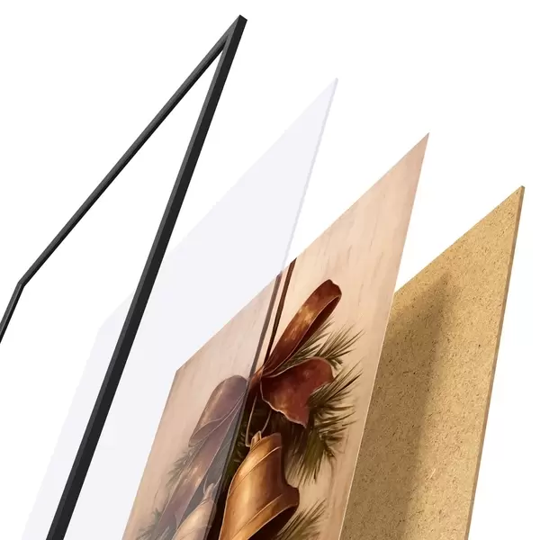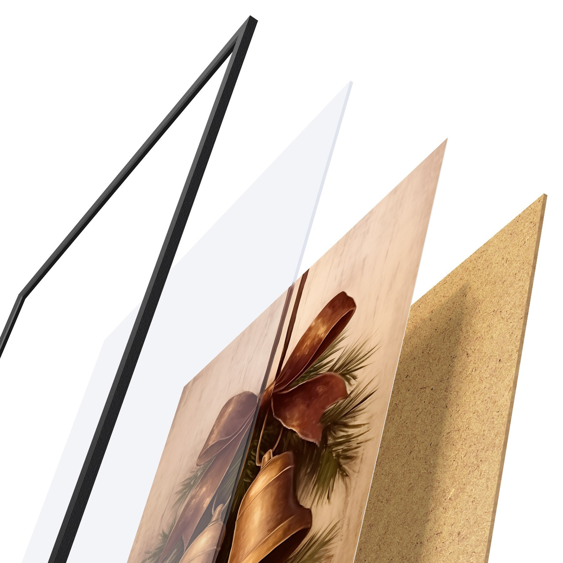 De poster bestaat uit een frame, plexiglas, geprinte afbeelding en spaanplaat achterkant. De poster kan meteen aan de muur worden gehangen dankzij de bevestigingen op de achterkant.