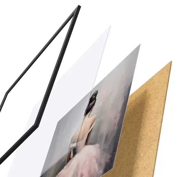De poster bestaat uit een frame, plexiglas, geprinte afbeelding en spaanplaat achterkant. De poster kan meteen aan de muur worden gehangen dankzij de bevestigingen op de achterkant.