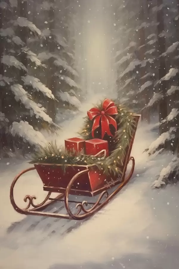 Poster Kerstslee met cadeaus in een besneeuwd bos N° f46630