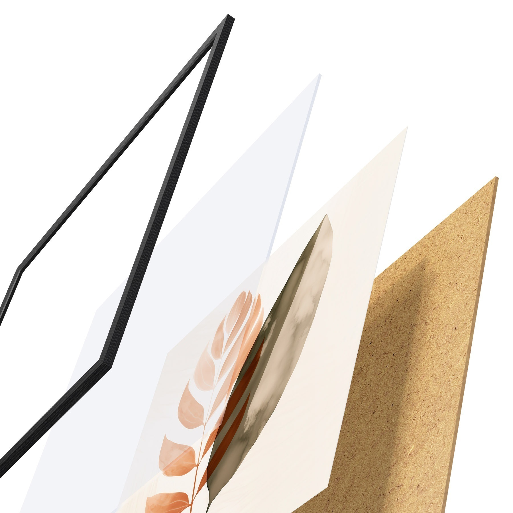 De poster bestaat uit een frame, plexiglas, geprinte afbeelding en spaanplaat achterkant. De poster kan meteen aan de muur worden gehangen dankzij de bevestigingen op de achterkant.