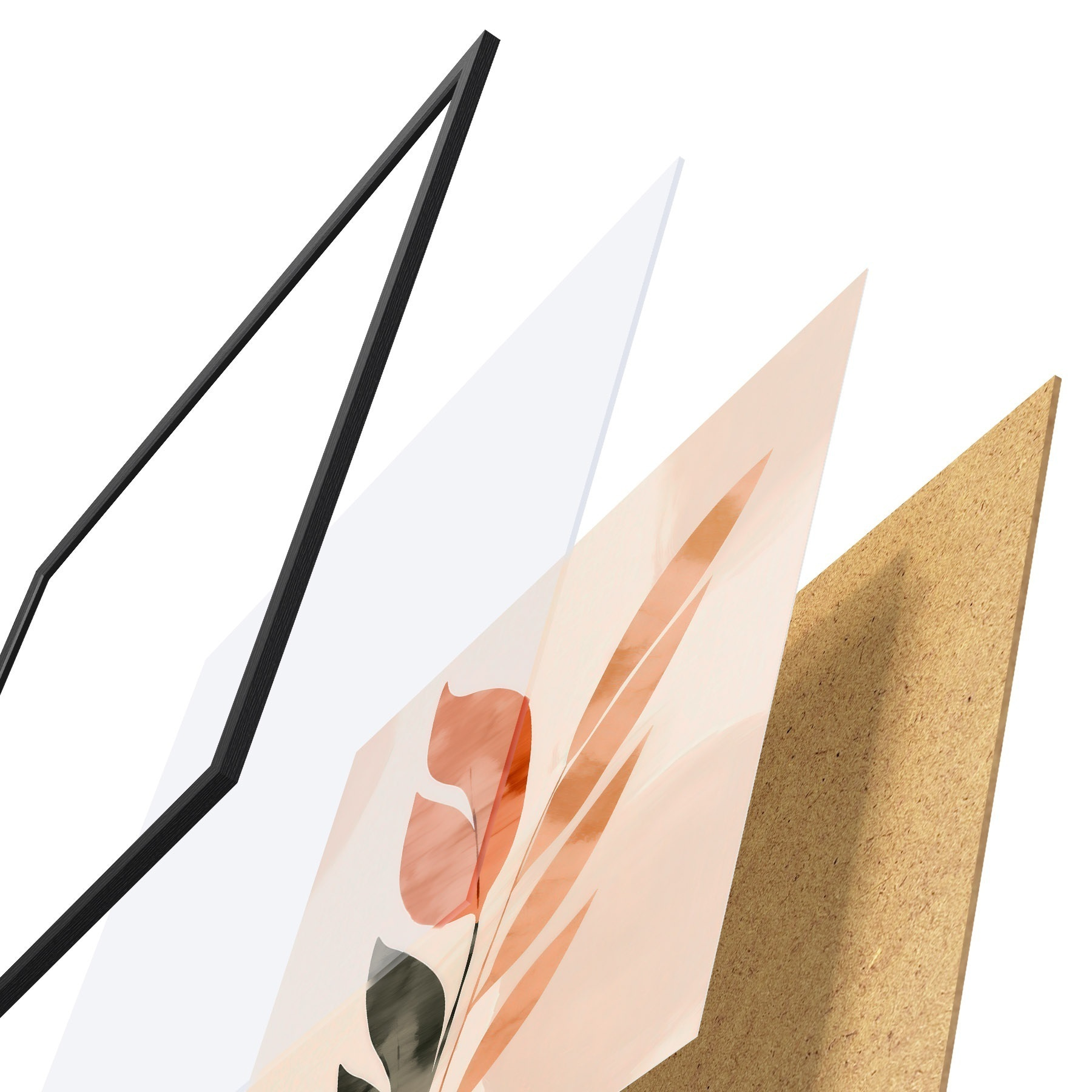 De poster bestaat uit een frame, plexiglas, geprinte afbeelding en spaanplaat achterkant. De poster kan meteen aan de muur worden gehangen dankzij de bevestigingen op de achterkant.