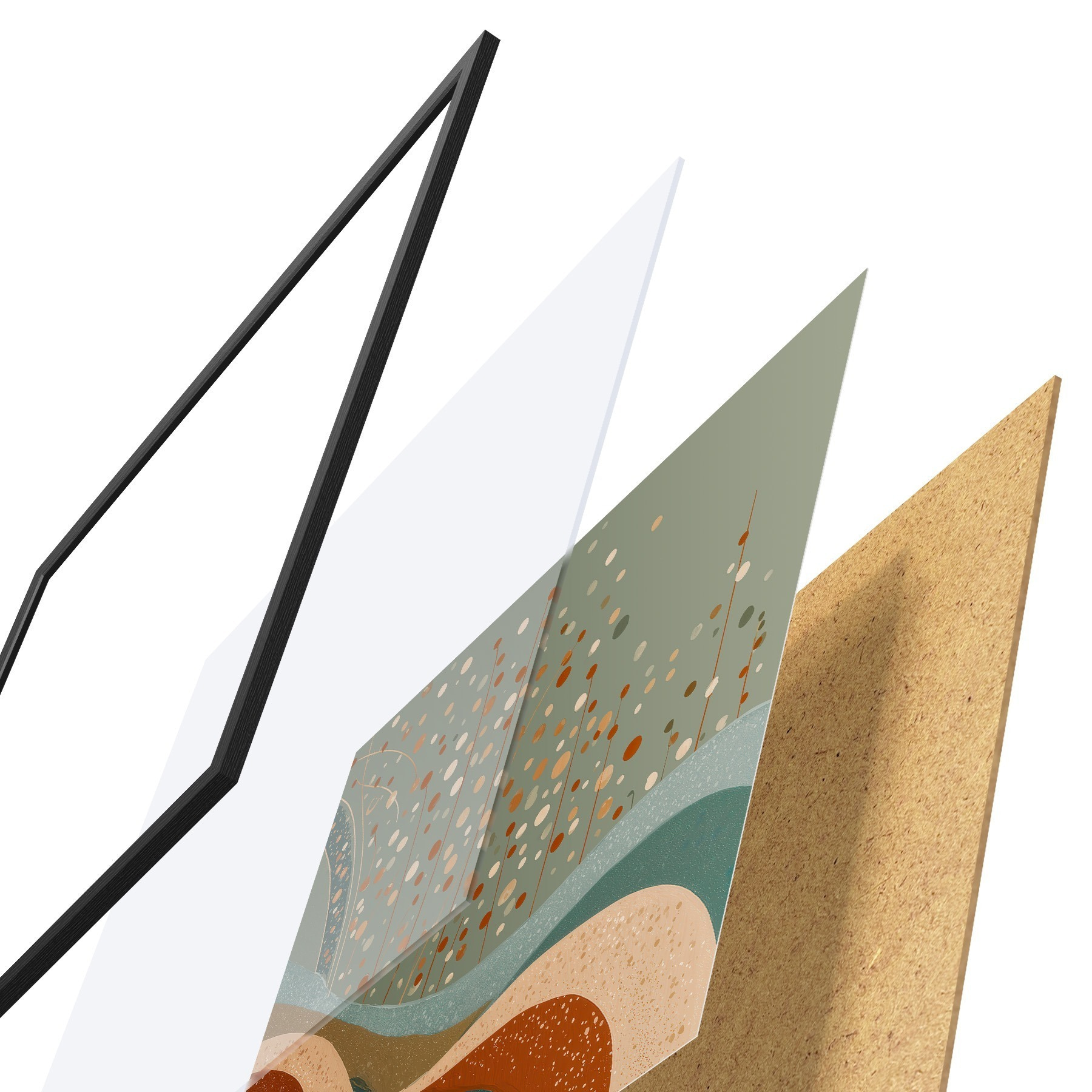 De poster bestaat uit een frame, plexiglas, geprinte afbeelding en spaanplaat achterkant. De poster kan meteen aan de muur worden gehangen dankzij de bevestigingen op de achterkant.