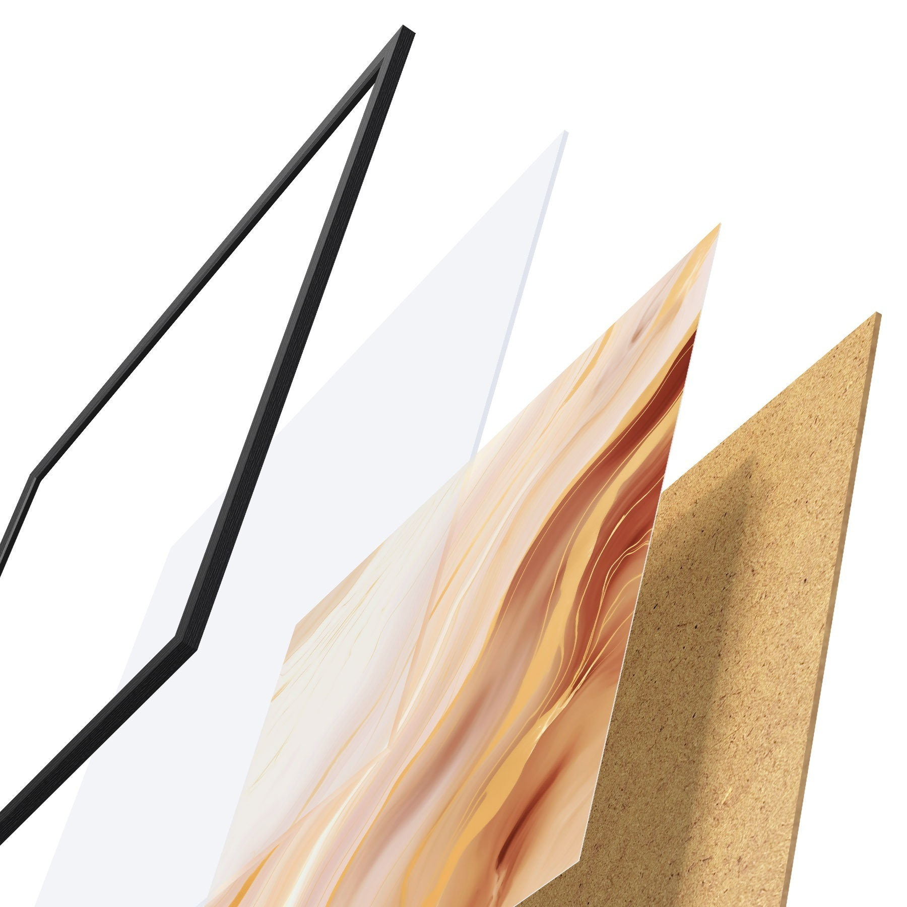 De poster bestaat uit een frame, plexiglas, geprinte afbeelding en spaanplaat achterkant. De poster kan meteen aan de muur worden gehangen dankzij de bevestigingen op de achterkant.