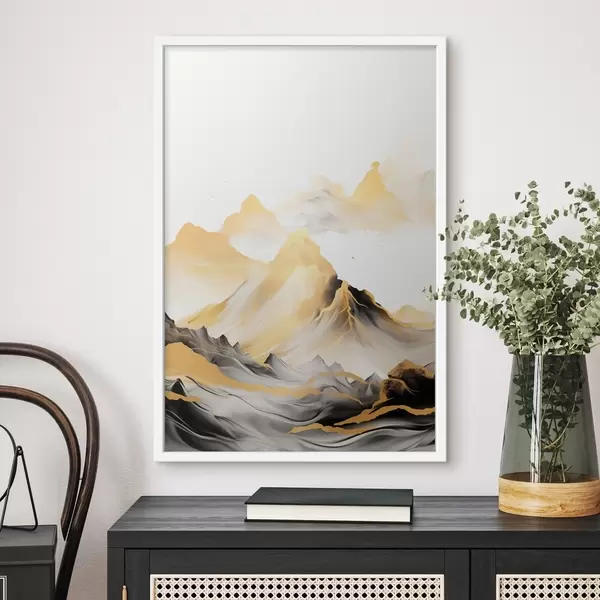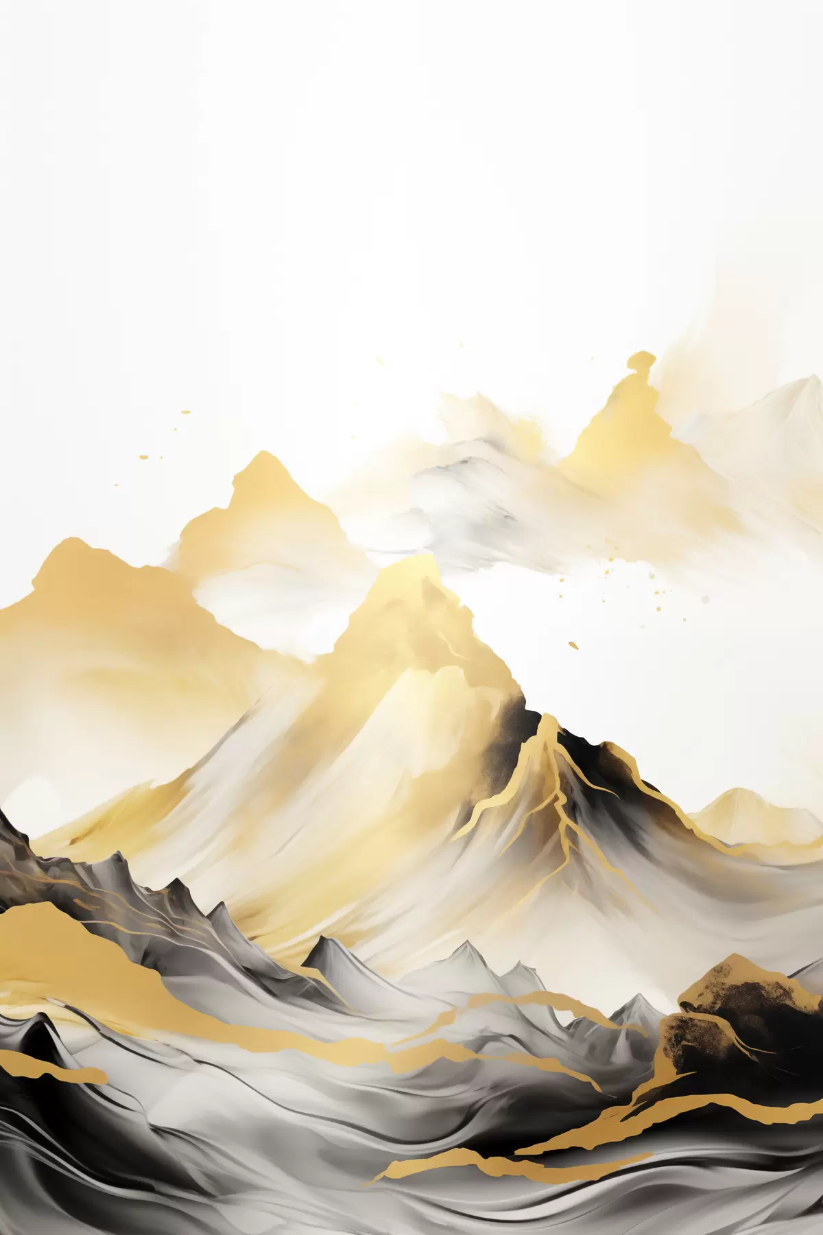 Poster Getextureerde gele en zwarte bergen met besneeuwde toppen, inktwasstijl, minimalistische bergketen N° f46684