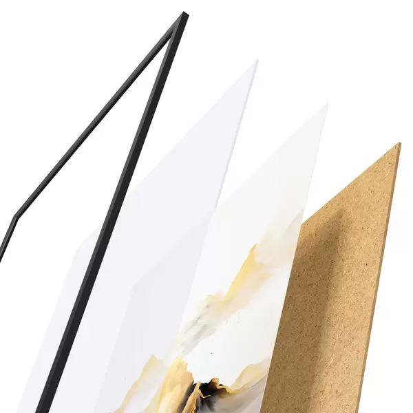 De poster bestaat uit een frame, plexiglas, geprinte afbeelding en spaanplaat achterkant. De poster kan meteen aan de muur worden gehangen dankzij de bevestigingen op de achterkant.