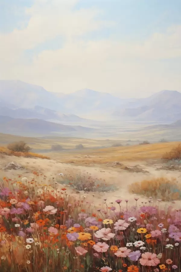 Poster Landschap, een veld met kleurrijke bloemen en bergen op de achtergrond, zachte pastelkleuren N° f46685
