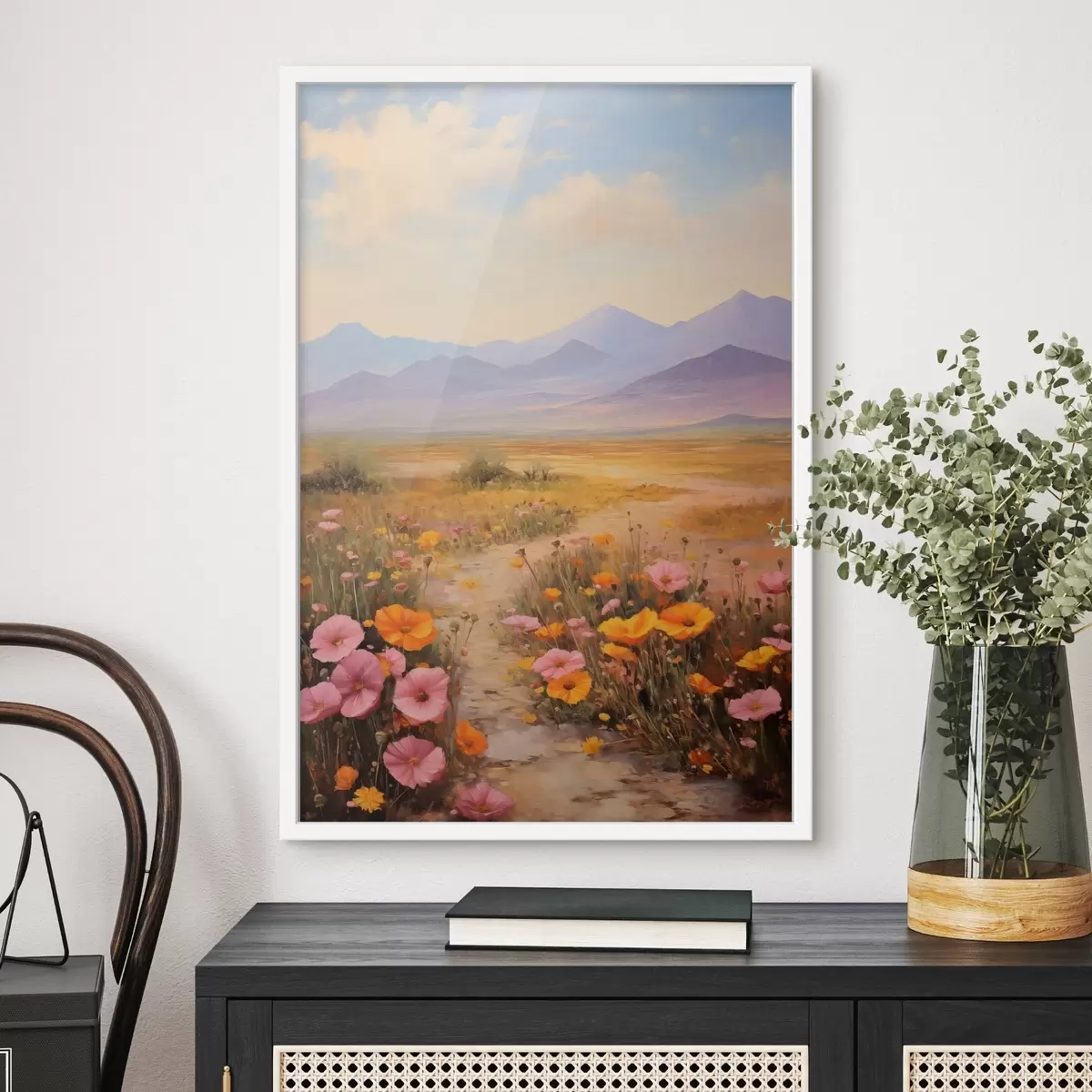 Poster Landschap, een veld met kleurrijke bloemen en bergen op de achtergrond, zachte pastelkleuren N° f46686