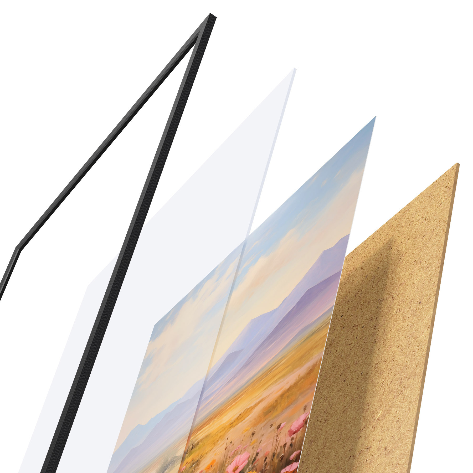 De poster bestaat uit een frame, plexiglas, geprinte afbeelding en spaanplaat achterkant. De poster kan meteen aan de muur worden gehangen dankzij de bevestigingen op de achterkant.
