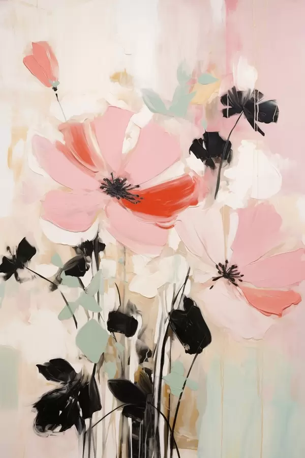 Poster Roze en zwarte bloemen met bladeren, zachte pastelkleuren, abstract bloemstuk, minimalistische kunst N° f46687