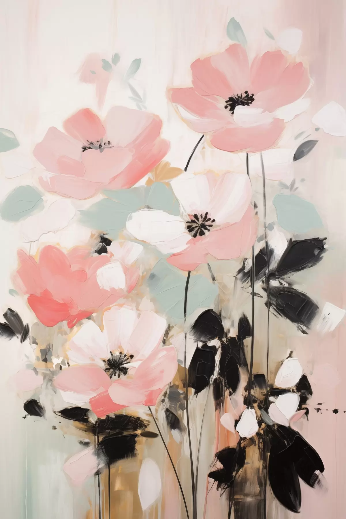 Poster Roze en zwarte bloemen met bladeren, zachte pastelkleuren, abstract bloemstuk, minimalistische kunst N° f46688