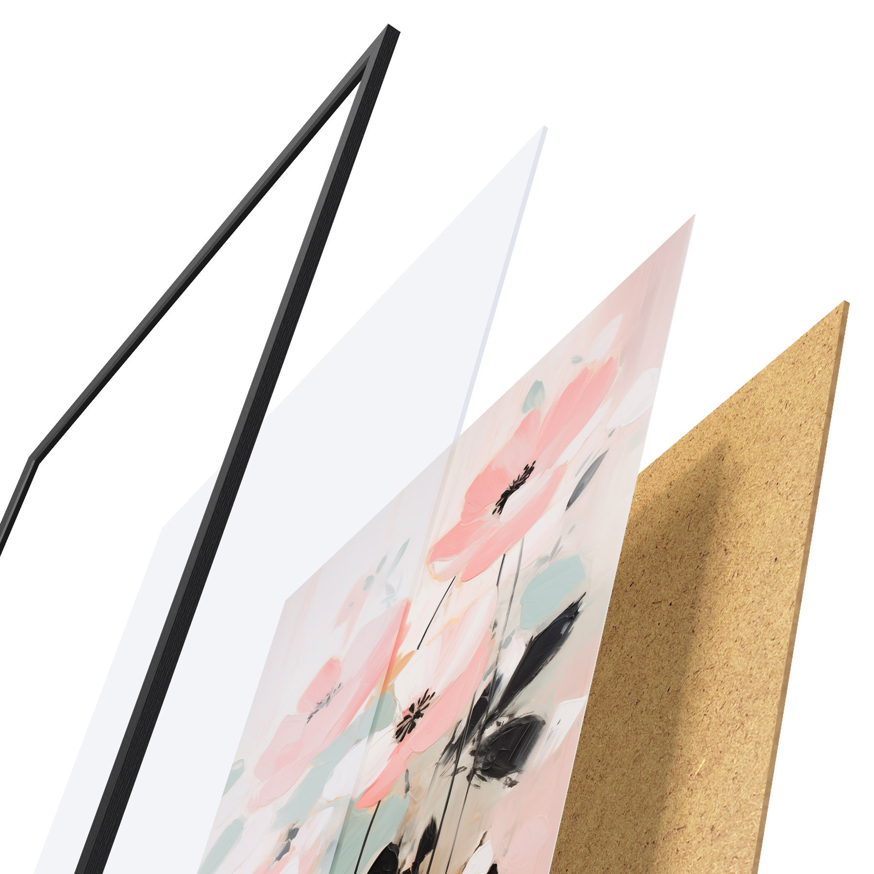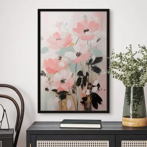 Poster Roze en zwarte bloemen met bladeren, zachte pastelkleuren, abstract bloemstuk, minimalistische kunst f46688