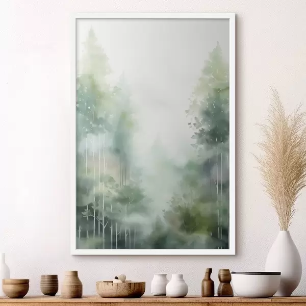 Poster Aquarelschilderij imitatie van abstract bos met hoge bomen en groen gebladerte, zachte gedempte kleuren N° f46689