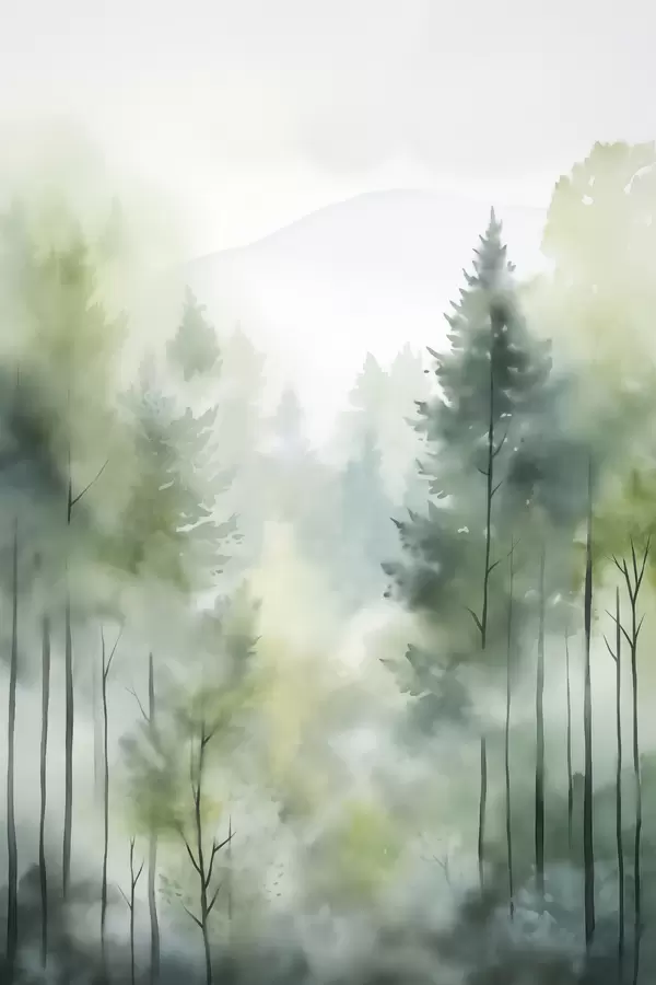 Poster Aquarelschilderij dat een mistig bos met hoge dennenbomen en bergen op de achtergrond imiteert N° f46690